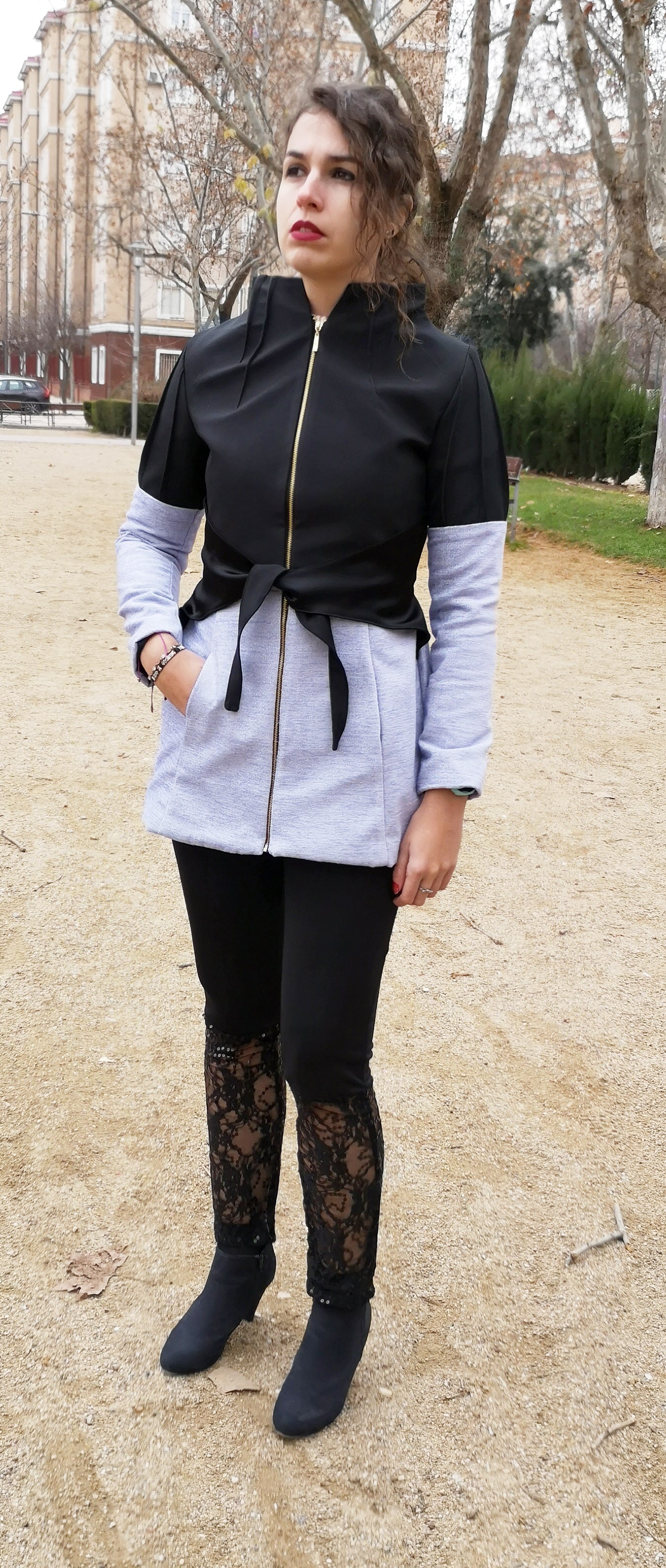 Cierre de cremallera y cinturón de adorno. Forro interior en negro