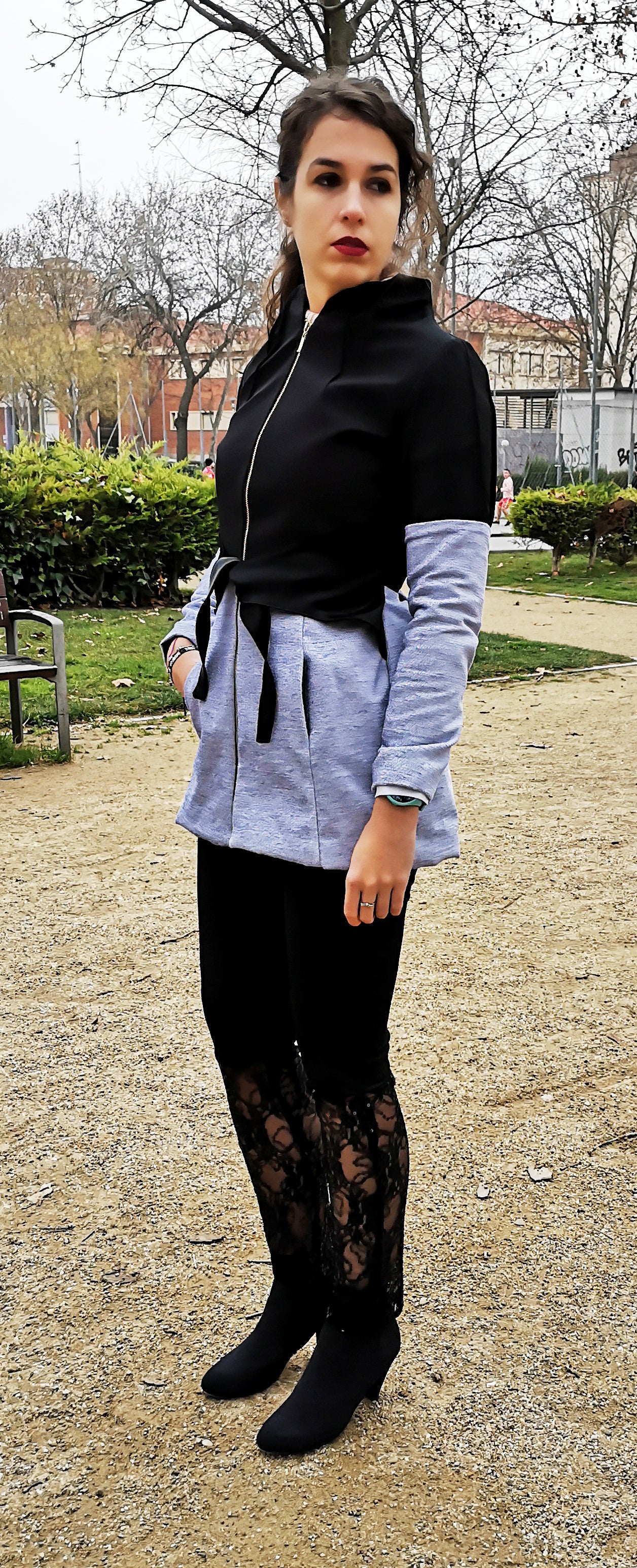 Abrigo bicolor con escote chimenea, Abrigo negro, abrigo azul corto