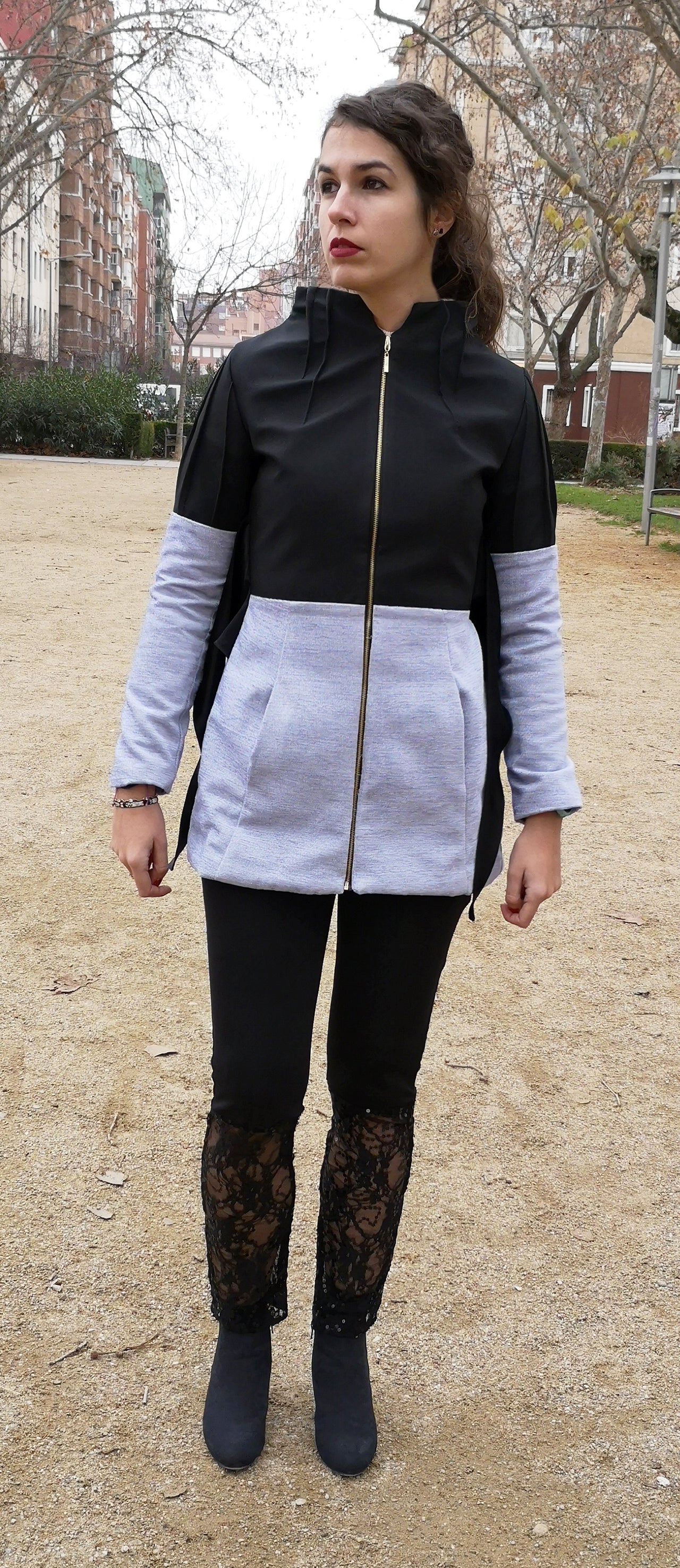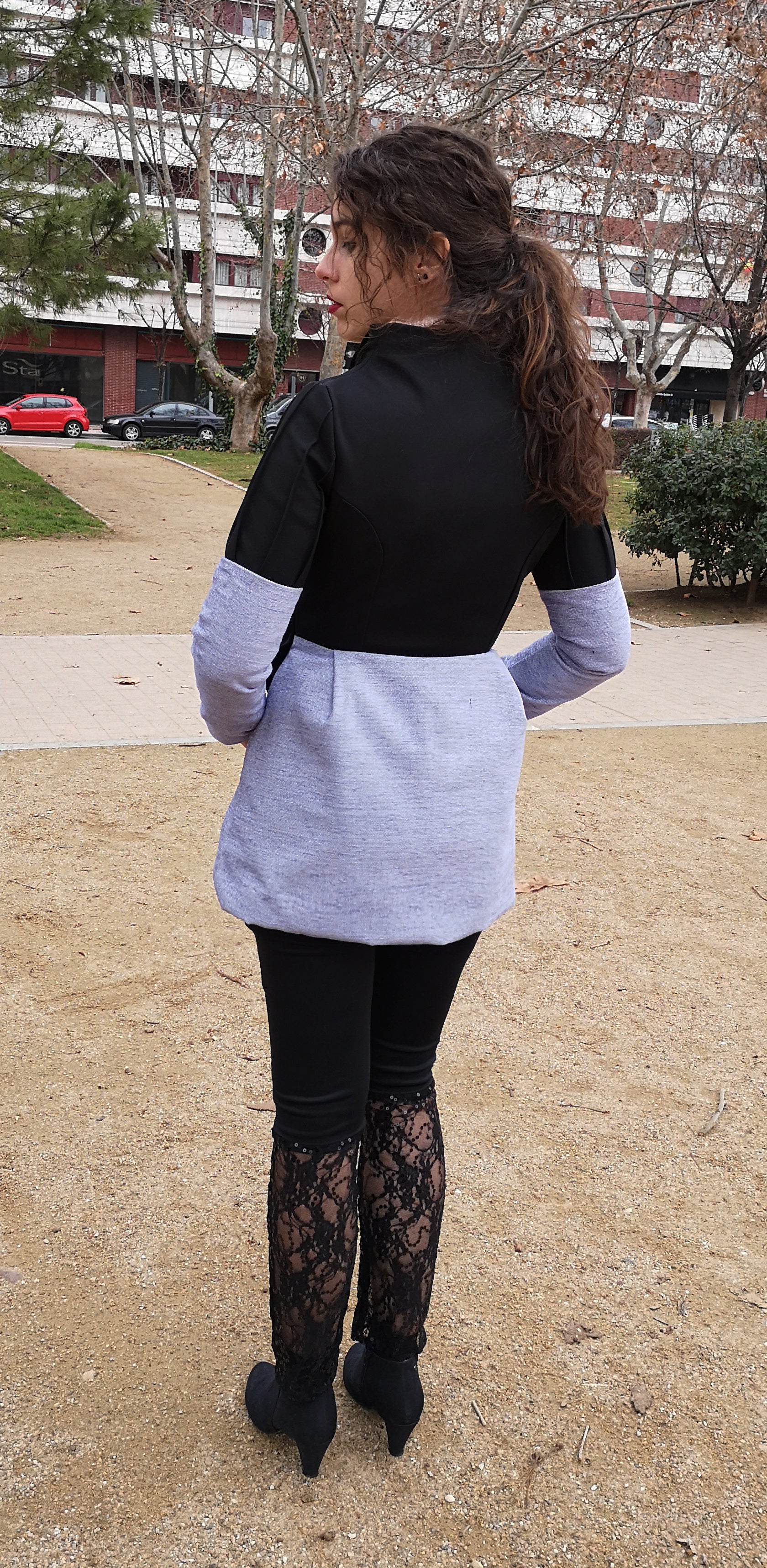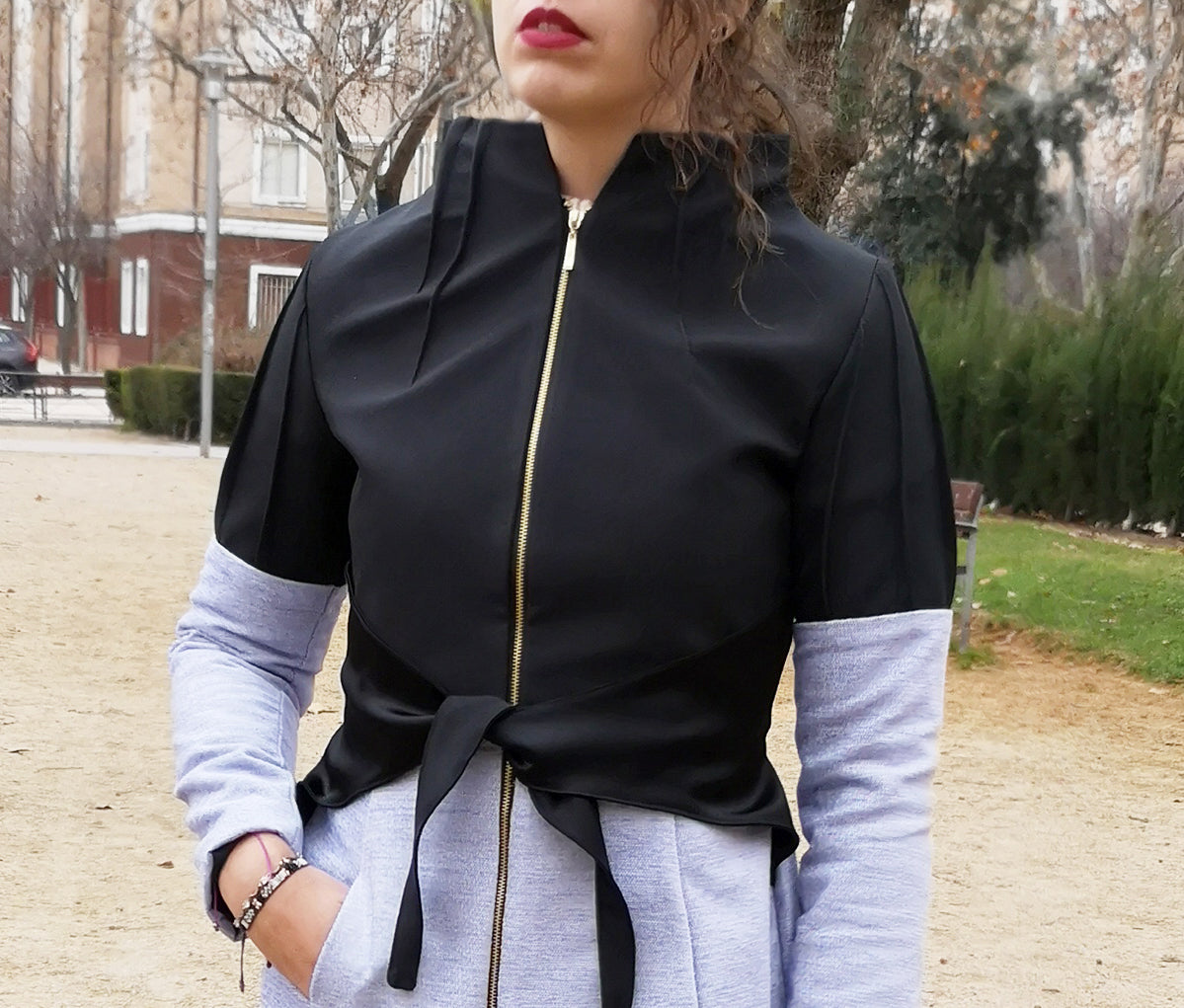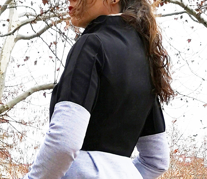Abrigo bicolor corto con escote chimenea, lleva detalles de jaretas en el escote y en las mangas.