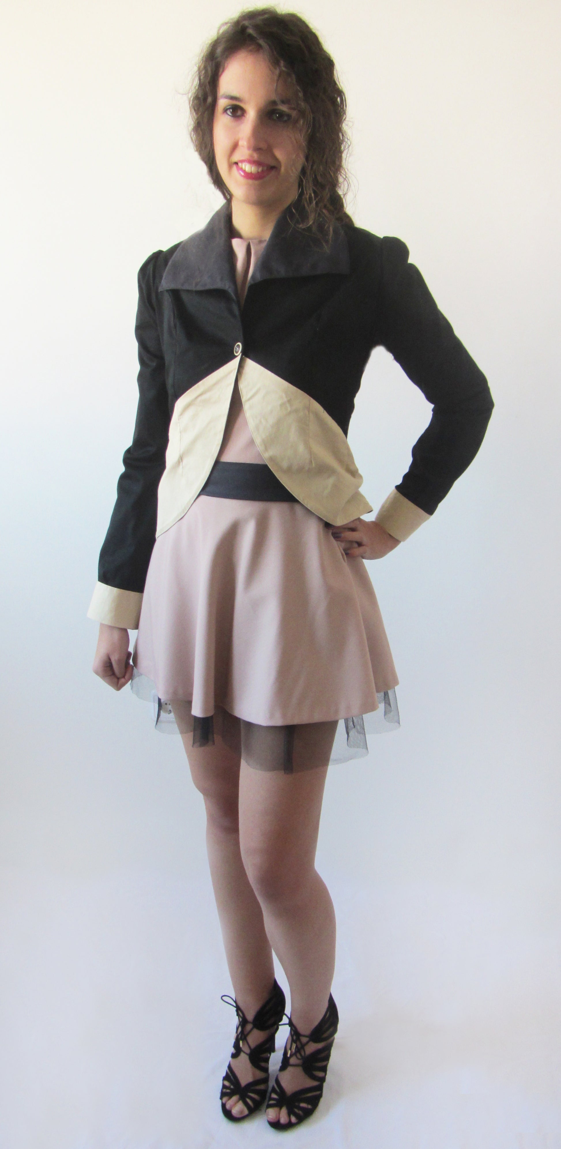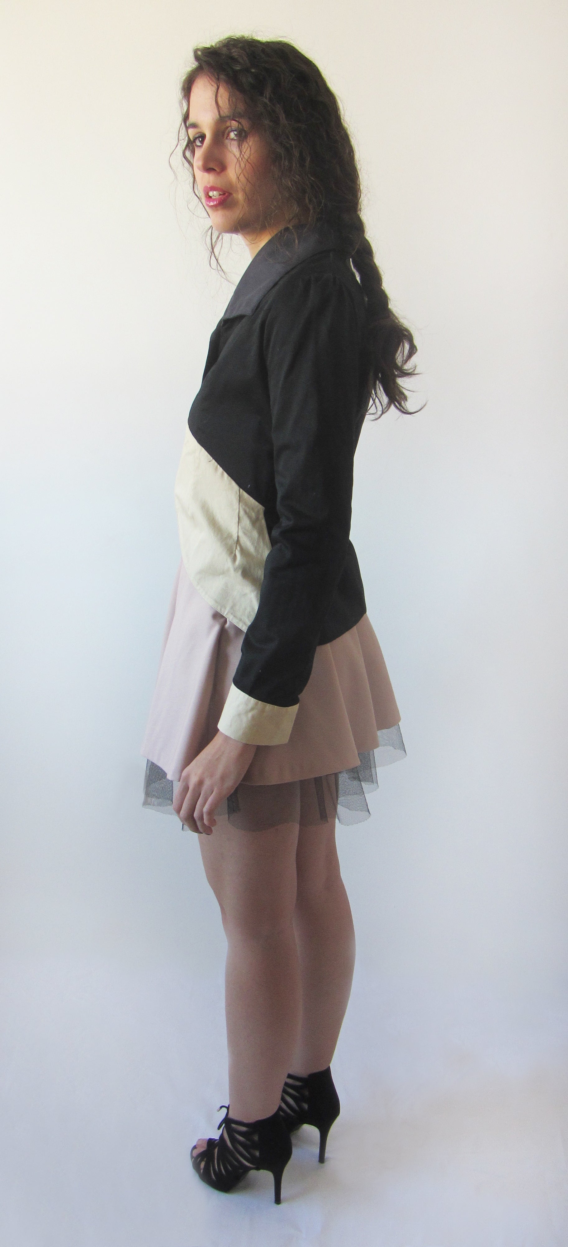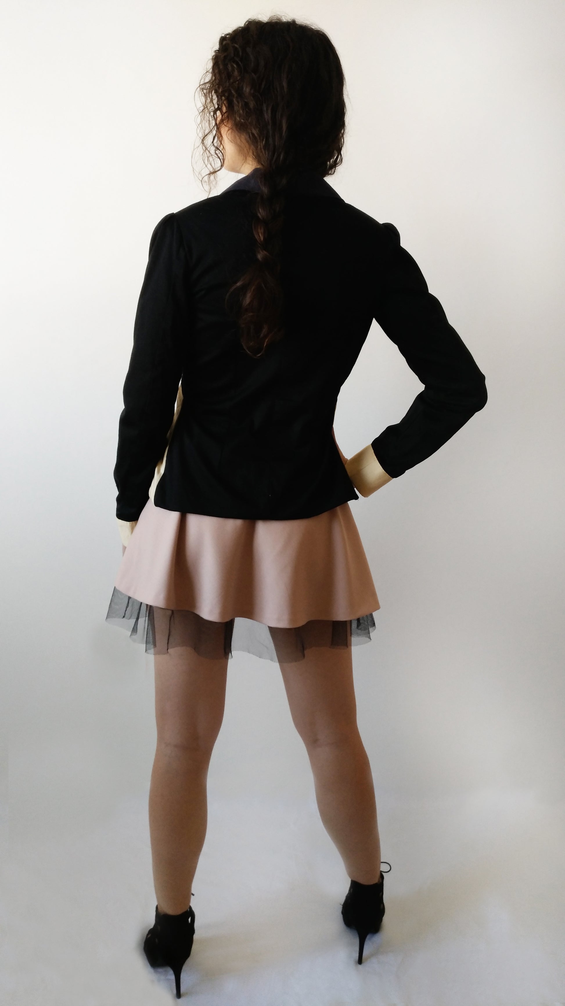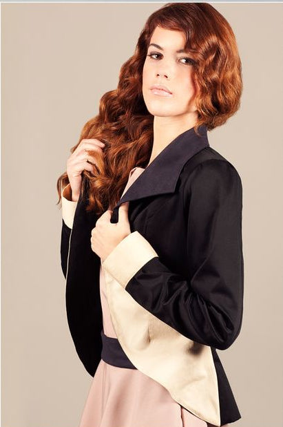 Americana bicolor que fusiona texturas y tonos para un resultado sofisticado. El cuello en antelina negra contrasta con el cuerpo en gabardina, combinando negro y camel en una composición que juega con la profundidad visual.